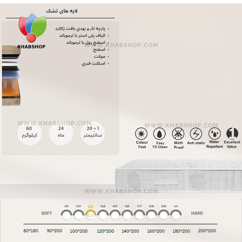 درجه نرمی و سفتی تشک: حدود ۱ از ۷ (نرمترین حالت): این درجه برای وزن حدود ۵۰ تا ۶۰ کیلوگرم مناسب است و با توجه به وزن افراد ممکن است کمی تغییر کند.