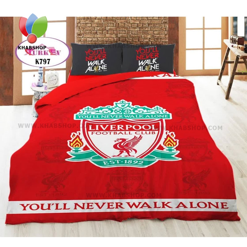 لوگوی باشکوه باشگاه لیورپول با پرنده لیور، شعلههای جاودانگی، و شعار معروف *"YOU'LL NEVER WALK ALONE"* که هم در بالای لوگو و هم در پایین روتختی تکرار شده.