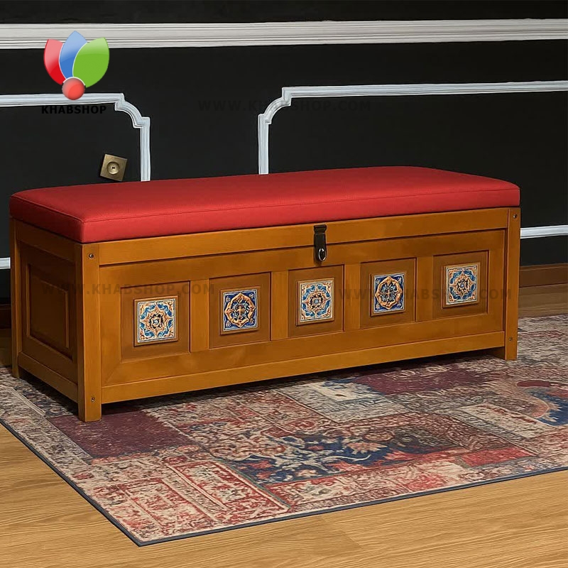 صندوقچه چوبی پاف نشیمن با کاشیهای سنتی: ترکیبی از هنر و کاربرد