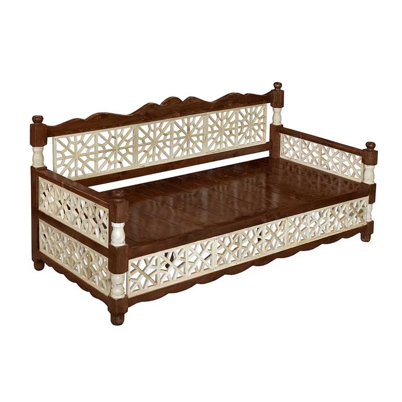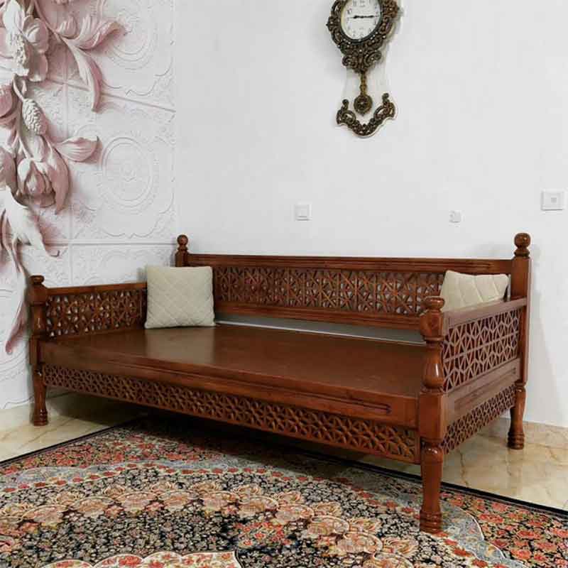زیبایی تخت سنتی تنها در سادگی فرم یا رنگ طبیعی چوب خلاصه نمیشود. هنر نجاری و منبتکاری ایرانی، که ریشه در قرنها تجربه و ذوق دارد، در ساخت این تختها جلوهگر است. در بسیاری از نمونهها، پایهها یا بدنه با نقشهای اسلیمی، گل و بته، یا طرحهای هندسی ظریف تزئین میشوند. این تزئینات نه تنها جلوهی بصری تخت را ارتقا میدهند، بلکه روحی از هنر ایرانی را در دل چوب زنده میکنند.